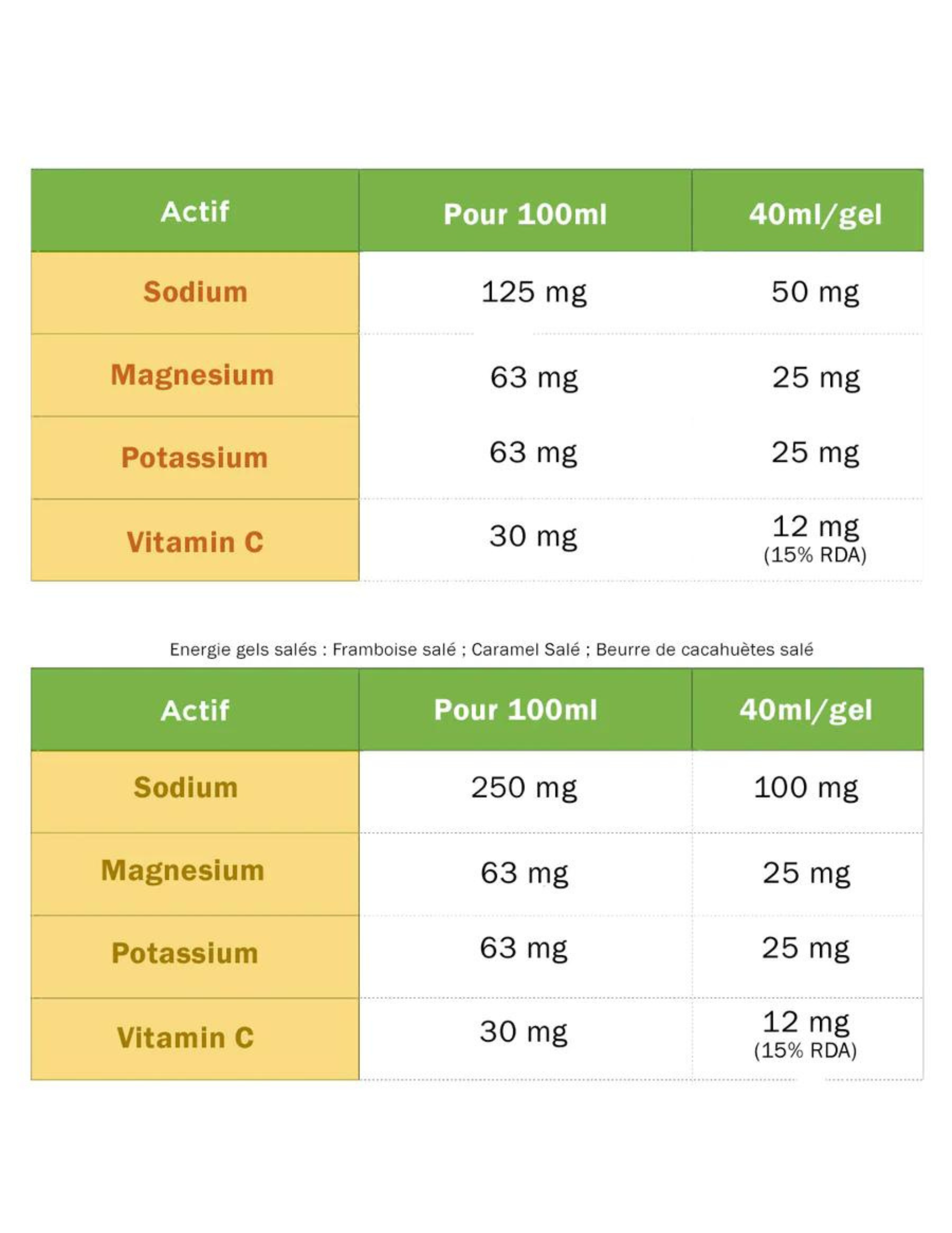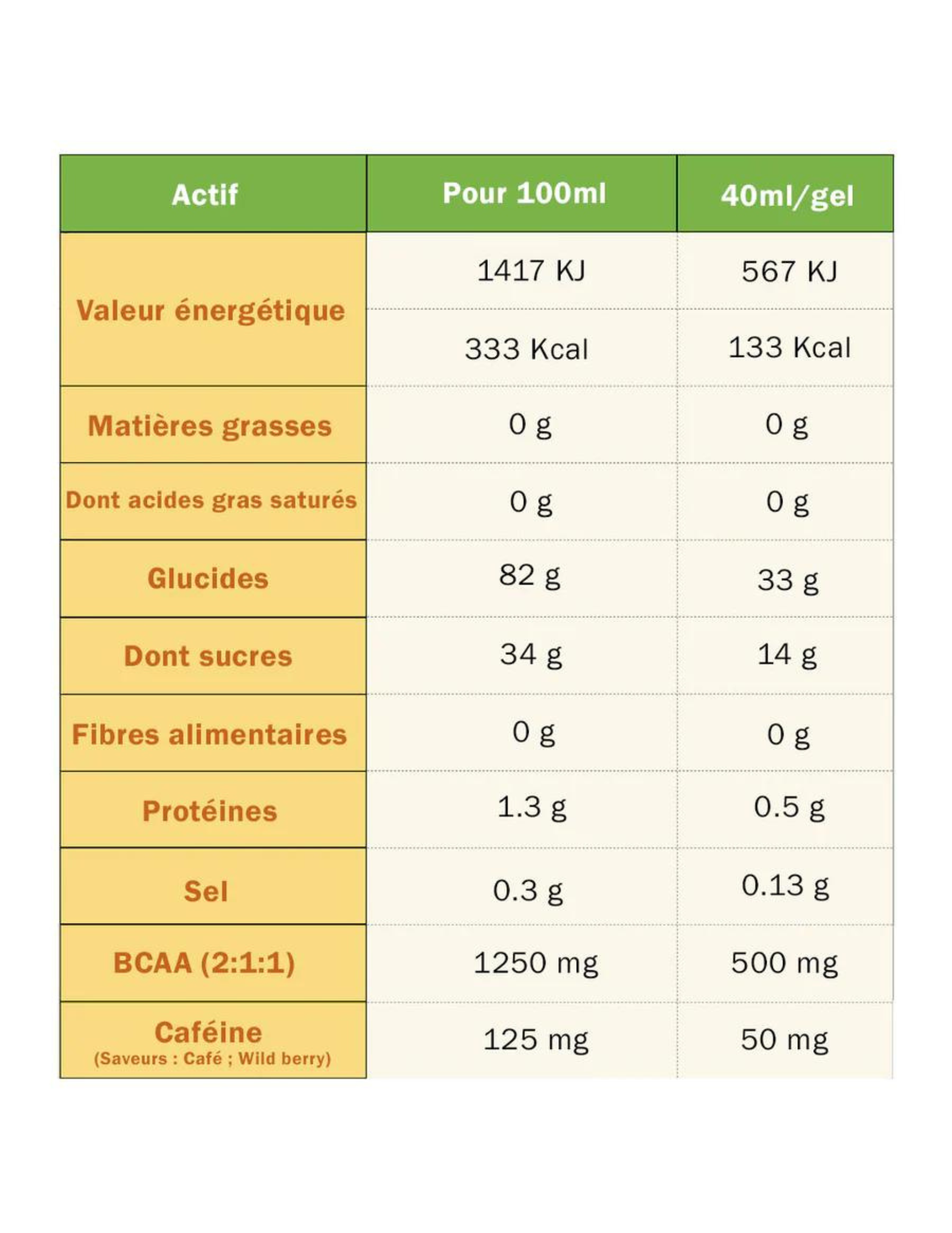 Sie sind eine Quelle schneller Kohlenhydrate, verzweigtkettiger Aminosäuren (BCAAs) und essentieller Muskelnährstoffe und sorgen für einen echten Energieschub. Jedes Energiegel liefert 133 kcal Energie, 33 g Kohlenhydrate und 500 mg BCAA und ist gleichzeitig mit Mineralsalzen angereichert, um den Elektrolytverlust während des Trainings auszugleichen.