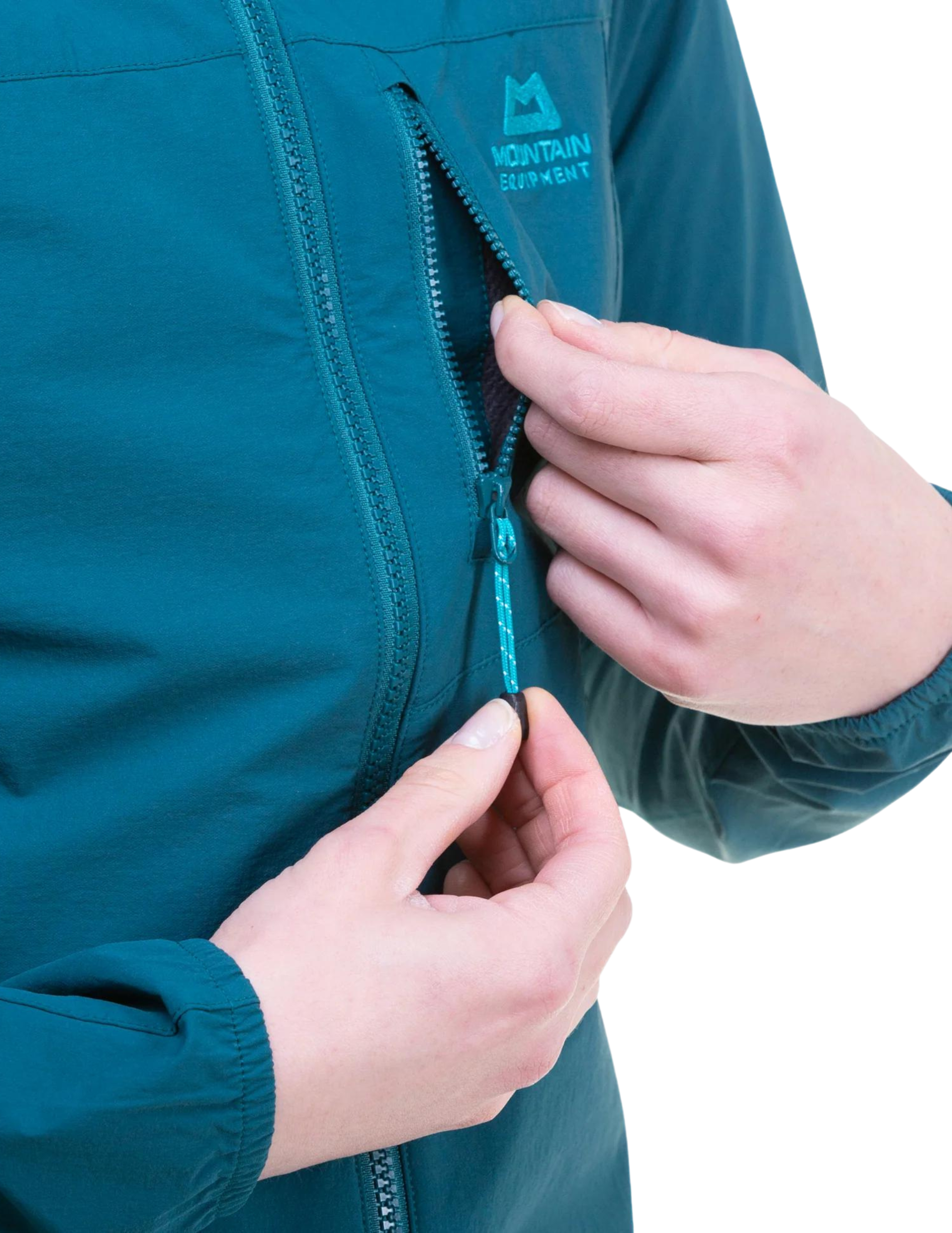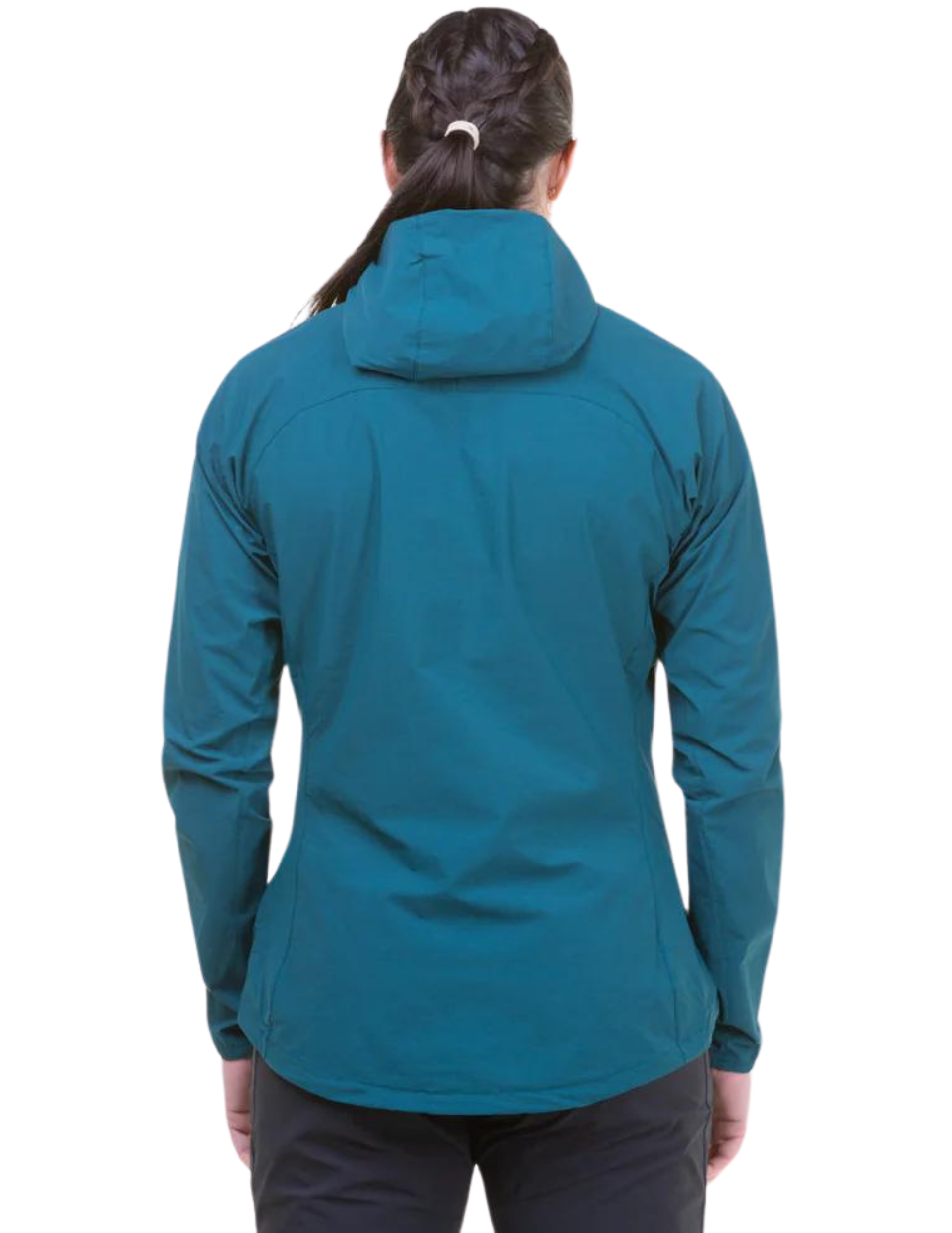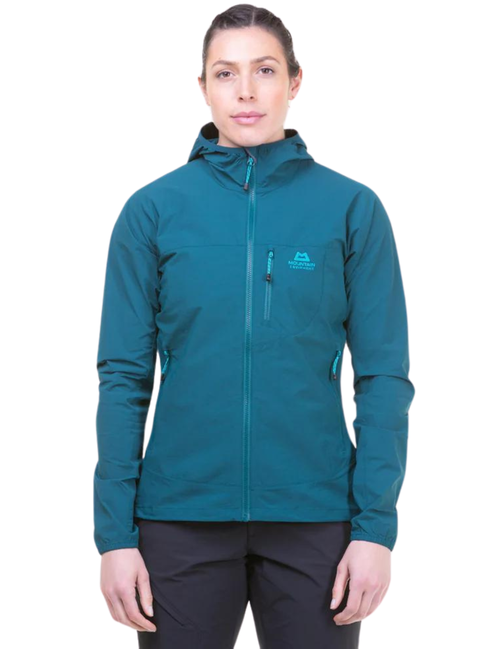 Die Echo Hooded von MOUNTAIN EQUIPMENT für Damen ist eine sehr leichte, elastische und besonders atmungsaktive Softshelljacke für alpine Rennen und lange Klettertage.