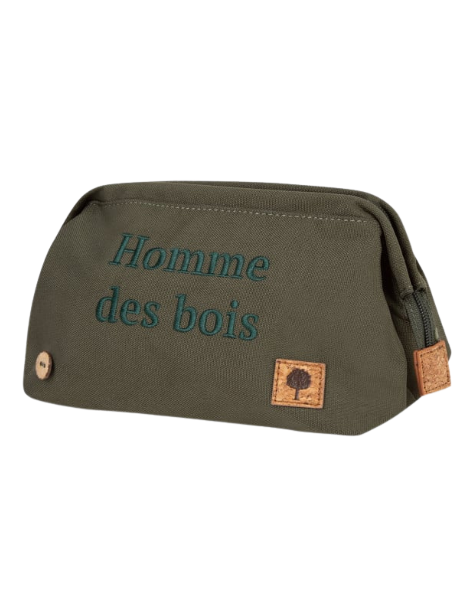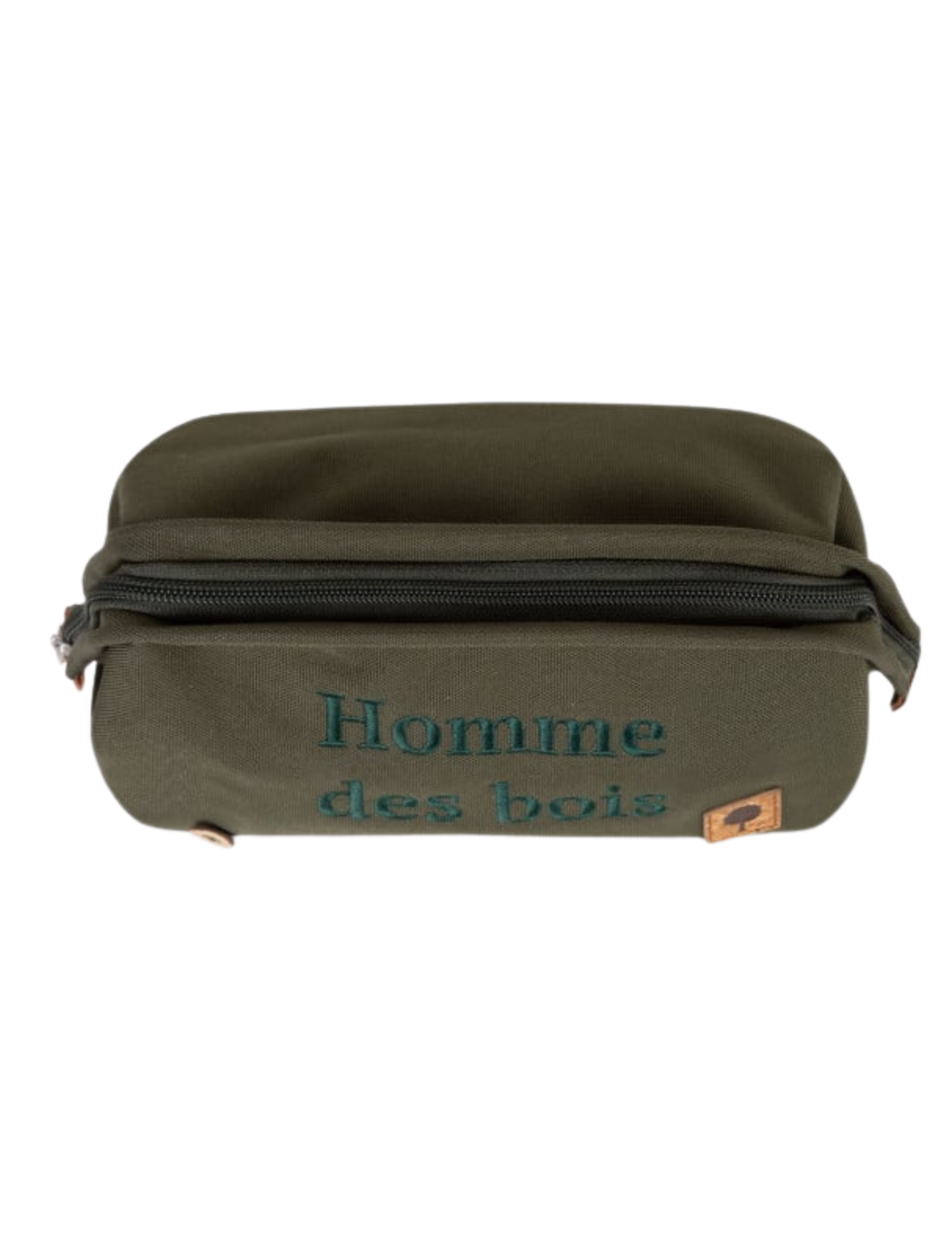 Cette trousse de toilette se distingue par une inscription brodée distinctive « Homme des Bois », ajoutant une note de caractère unique à cet accessoire.